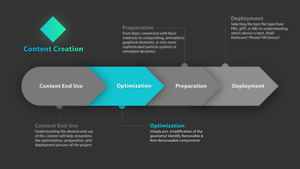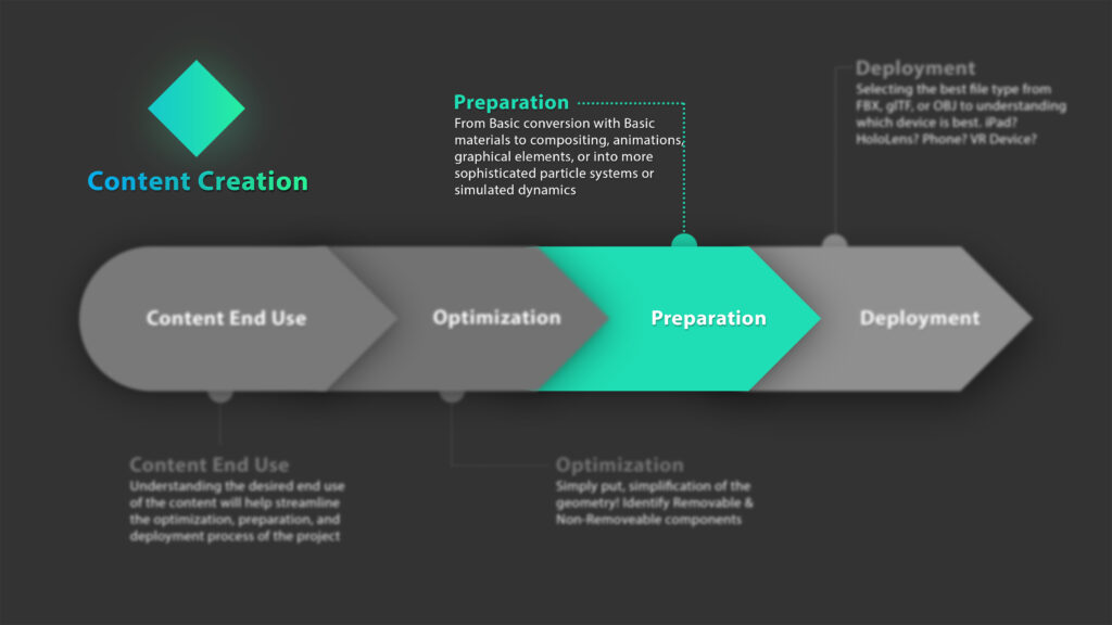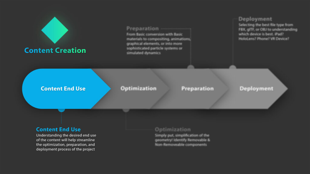 Before we begin to build any 3D content for Mixed Reality we really need to understand what the intended end use is. It’s imperative because it aids in the steps of Optimization, Preparation, and Deployment. Some examples of some end-uses for 3D Content could be anything from Trade Shows, could be plant assessments, maybe FATs, or maybe we are building some highly industry-specific 3D Models for Sales & Marketing. We could go even as far as the content we are building for Maintenance or Sanitation Training as well. I mean the list really goes on and on. So just be sure to spend time really thinking in this specific step.